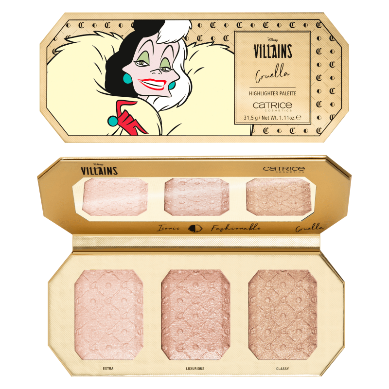 La palette de surligneurs CATRICE Disney Villains Cruella a beaucoup à offrir : la formule en poudre crémeuse assure non seulement un éclat parfait, mais les différentes teintes vous offrent également un choix de trois teintes. Et ce n'est pas tout : Cruella de Vil figure sur l'emballage - un accroche-regard absolu. La texture peut être parfaitement appliquée avec le pinceau surligneur Ursula de l'ensemble d'outils de maquillage et de sac essence Disney Villains.