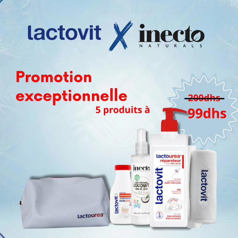 Lotion réparatrice Lactovit : nourrit et répare la peau en profondeur Gel douche Lactovit – format voyage : nettoie délicatement tout en respectant l’équilibre de la peau Huile de coco Inecto : hydrate, adoucit et apporte de la brillance à la peau et aux cheveux Serviette en coton Lactovit : douce, absorbante et pratique Trousse Lactovit : idéale pour ranger et transporter vos produits facilement