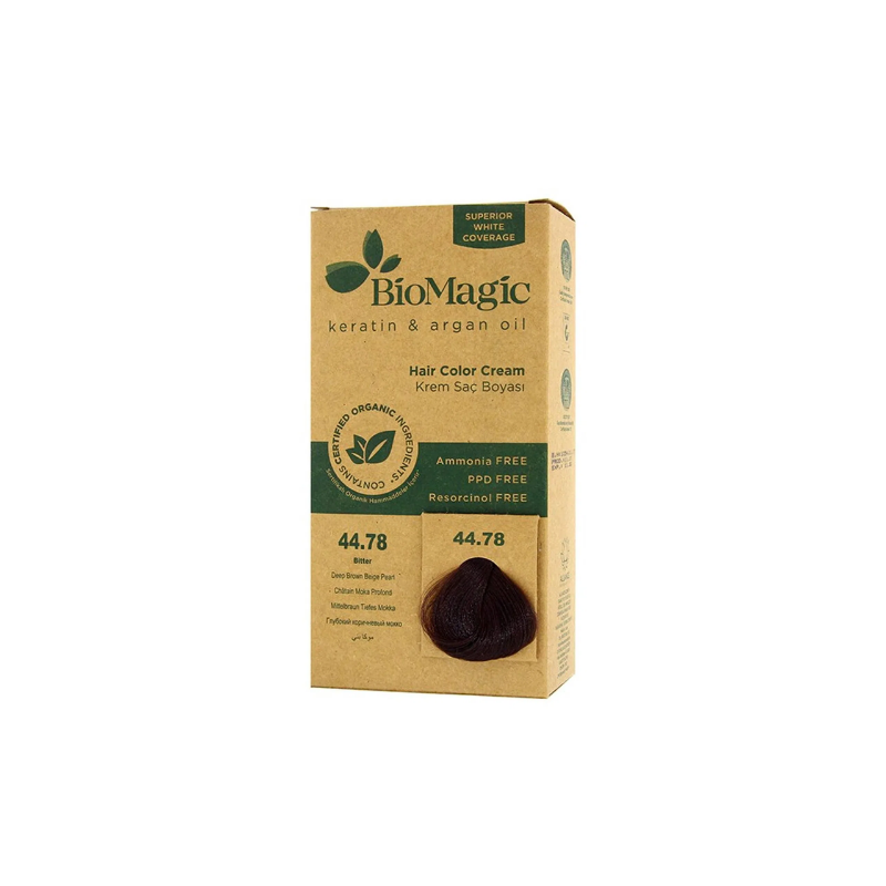 La Hair Color Cream Kit 44/78 BioMagic est une coloration capillaire enrichie en ingrédients certifiés biologiques, formulée sans ammoniaque, sans PPD et sans résorcinol. Grâce à sa technologie avancée de microémulsion anti-âge, elle assure une pénétration optimale des pigments au cœur de la fibre capillaire pour une couleur intense, précise et longue durée. Sa formule est enrichie en kératine pour renforcer et réparer la structure du cheveu, ainsi qu’en huile d’argan riche en vitamines et acides gras pour nourrir, hydrater et apporter brillance et douceur. L’actif végétal HELIOGENOL protège la couleur contre la décoloration et les agressions extérieures comme les UVA. Adaptée aux cuirs chevelus sensibles, elle garantit une couvrance parfaite des cheveux blancs sans irritation.