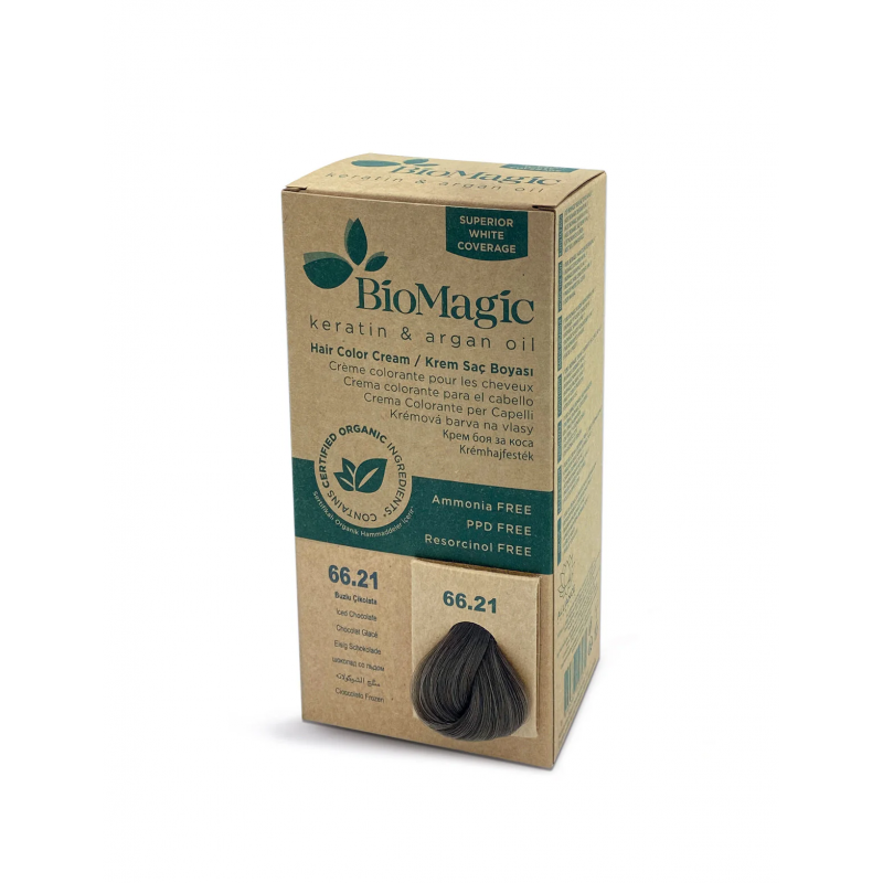 Le Kit Coloration Creme Cheveux 66/21 BIOMAGIC est une coloration permanente enrichie en ingredients organiques, formulee sans ammoniaque, sans PPD et sans resorcinol. Sa composition douce respecte la fibre capillaire tout en offrant une couvrance parfaite des cheveux blancs. Enrichie en keratine et en huile d argan, elle nourrit, renforce et apporte brillance et vitalite aux cheveux. Sa technologie avancee assure une couleur intense, lumineuse et durable des la premiere application, pour un resultat professionnel a domicile. Adaptée aux cuirs chevelus sensibles, elle colore les cheveux dans des conditions optimales sans provoquer d irritation.
