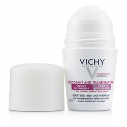 Déodorant roll-on anti-transpirant pour peaux sensibles. Sa formule « sans traces » ne laisse ni marques blanches ni taches jaunes. Empêche les vêtements de se raidir sous les aisselles. Offre une protection déodorante longue durée tout en douceur. Procure une sensation de fraîcheur immédiate. Testé sur peaux sensibles sous contrôle dermatologique. Marque : Vichy. Gamme : Déodorant anti-transpirant Beauty Deo 48h Roll-on. Genre : Unisexe. Catégorie : Bain et Corps. Sous-type : Déodorant. Groupe : Soins du corps