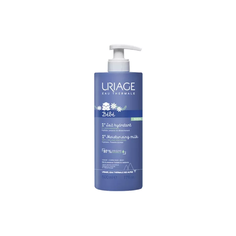 1er Lait Hydratant Bébé Uriage hydrate durablement grâce au complexe naturel Eau Thermale d’Uriage et Edelweiss bio, associé au squalane végétal. Il nourrit, protège et renforce la barrière cutanée tout en préservant la peau fragile du dessèchement. Sa texture fondante, légère et non grasse permet un habillage rapide et procure confort immédiat. Testé sous contrôle dermatologique et pédiatrique, il convient à un usage quotidien dès le plus jeune âge.