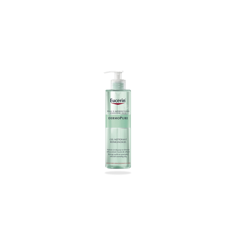EUCERIN DermoPure Gel Nettoyant élimine efficacement et en douceur l'excès de sébum, tout en enlevant les impuretés et le maquillage, grâce à sa formule sans savon avec 6% de Tensioactifs Amphotères. La peau du visage est propre, fraîche et souple. Non-comédogène.